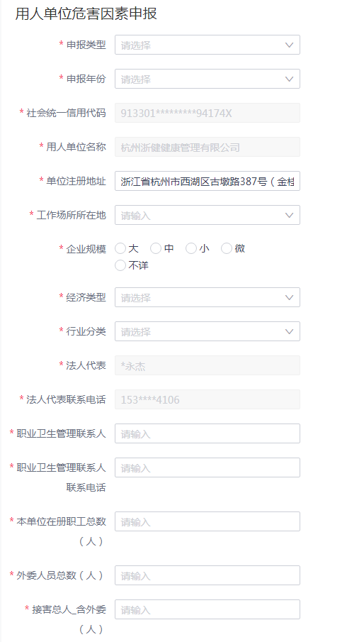 9. 根據(jù)提示內(nèi)容填寫信息,包括社會(huì)統(tǒng)一信用代碼、用人單位名稱、注冊(cè)地址、規(guī)模以及經(jīng)濟(jì)類型、行業(yè)分類、法人代表、聯(lián)系電話、各類人數(shù)等一系列單位基本信息,以及申報(bào)類型和年份,帶有*的必填
