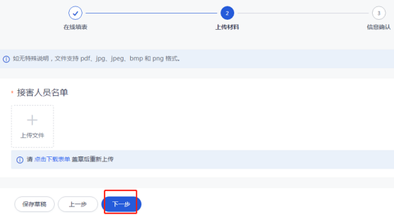 10. 上傳材料后,點(diǎn)擊“下一步”