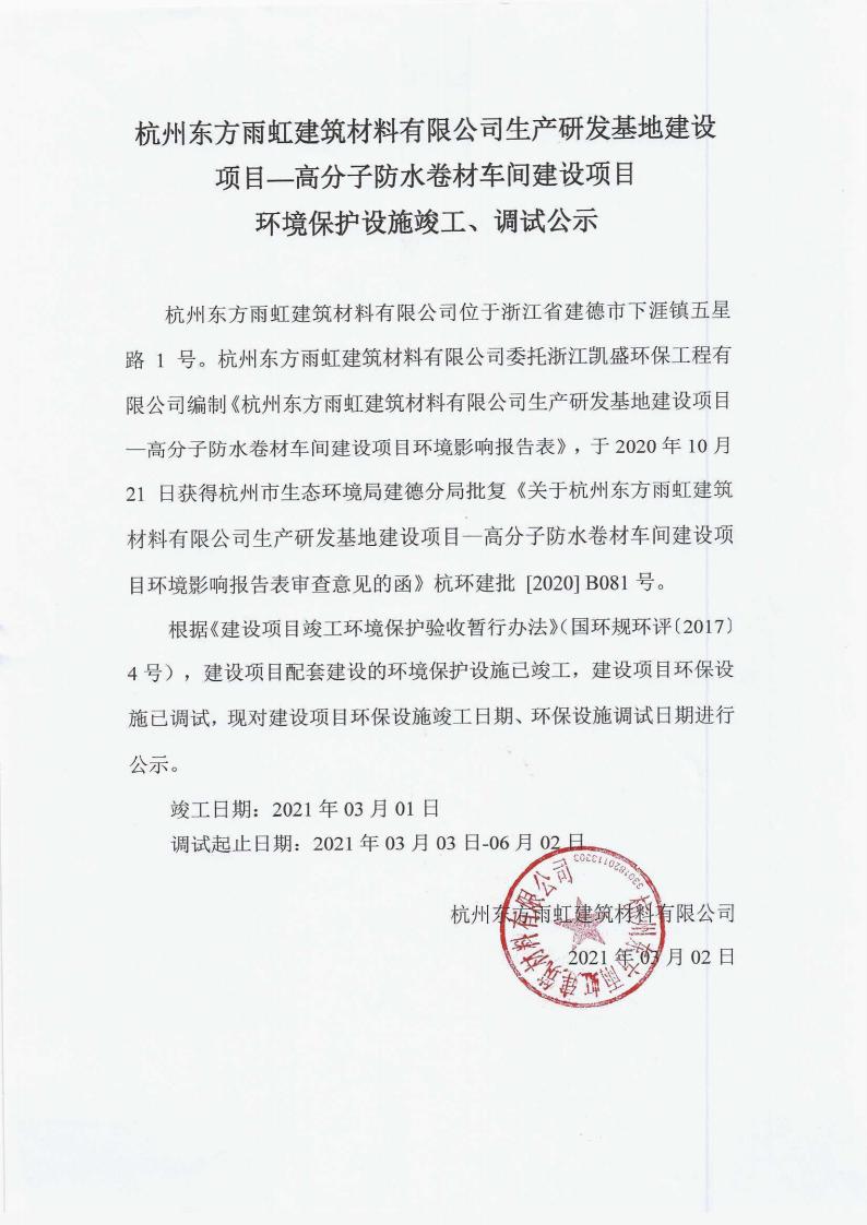 杭州東方雨虹建筑材料有限公司生產(chǎn)研發(fā)基地建設(shè)項目—高分子防水卷材車間建設(shè)項目環(huán)境保護設(shè)施竣工、調(diào)試公示