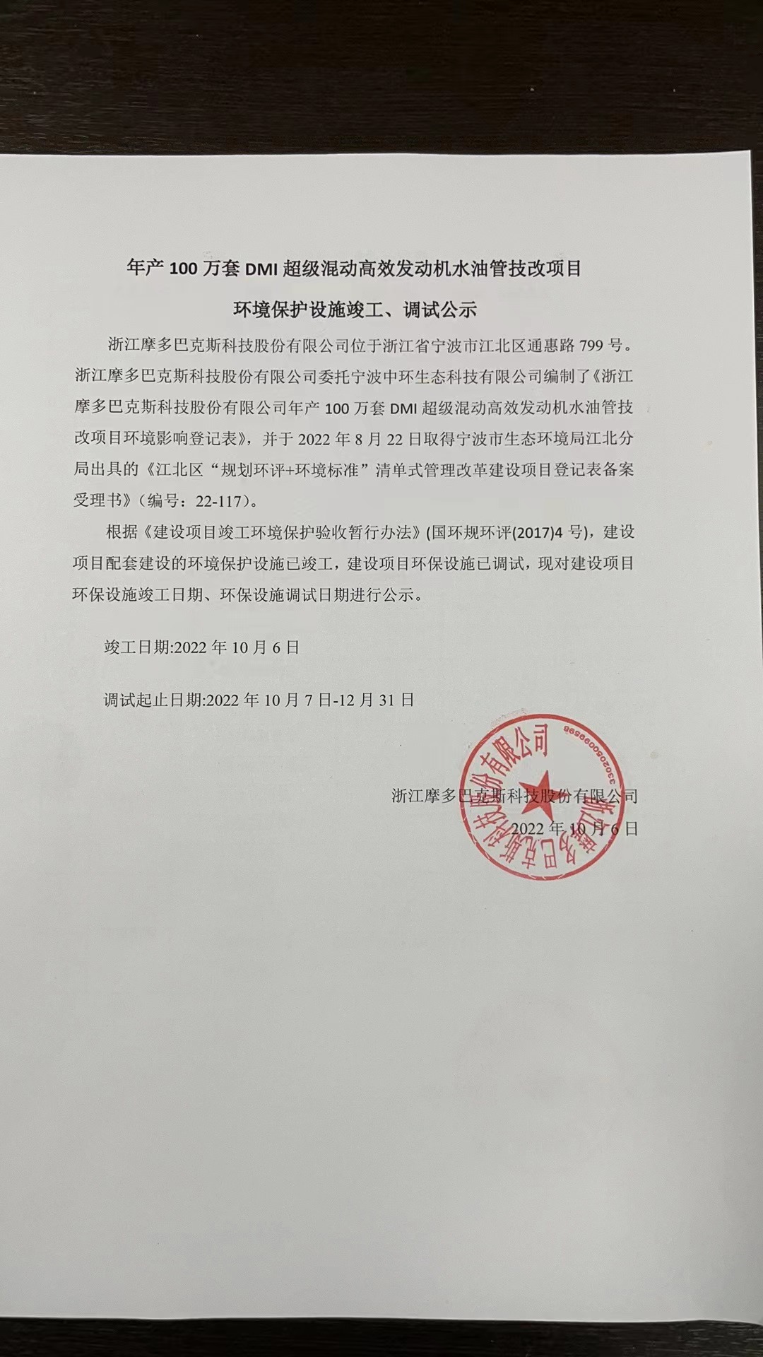 年產(chǎn)100萬套DMI超級混動(dòng)高效發(fā)動(dòng)機(jī)水油管技改項(xiàng)目環(huán)保設(shè)施竣工、調(diào)試公示