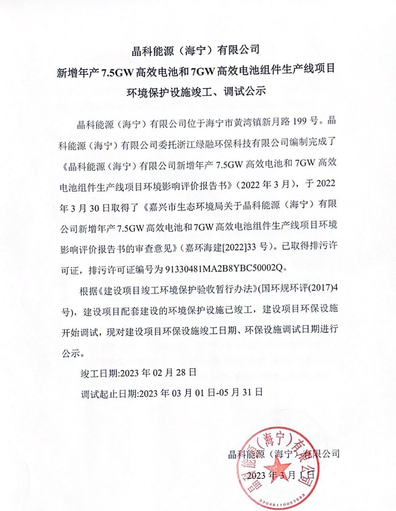 晶科能源(海寧)有限公司新增年產7.5GW高效電池和7GW高效電池組件生產線項目環保設施竣工、調試公示